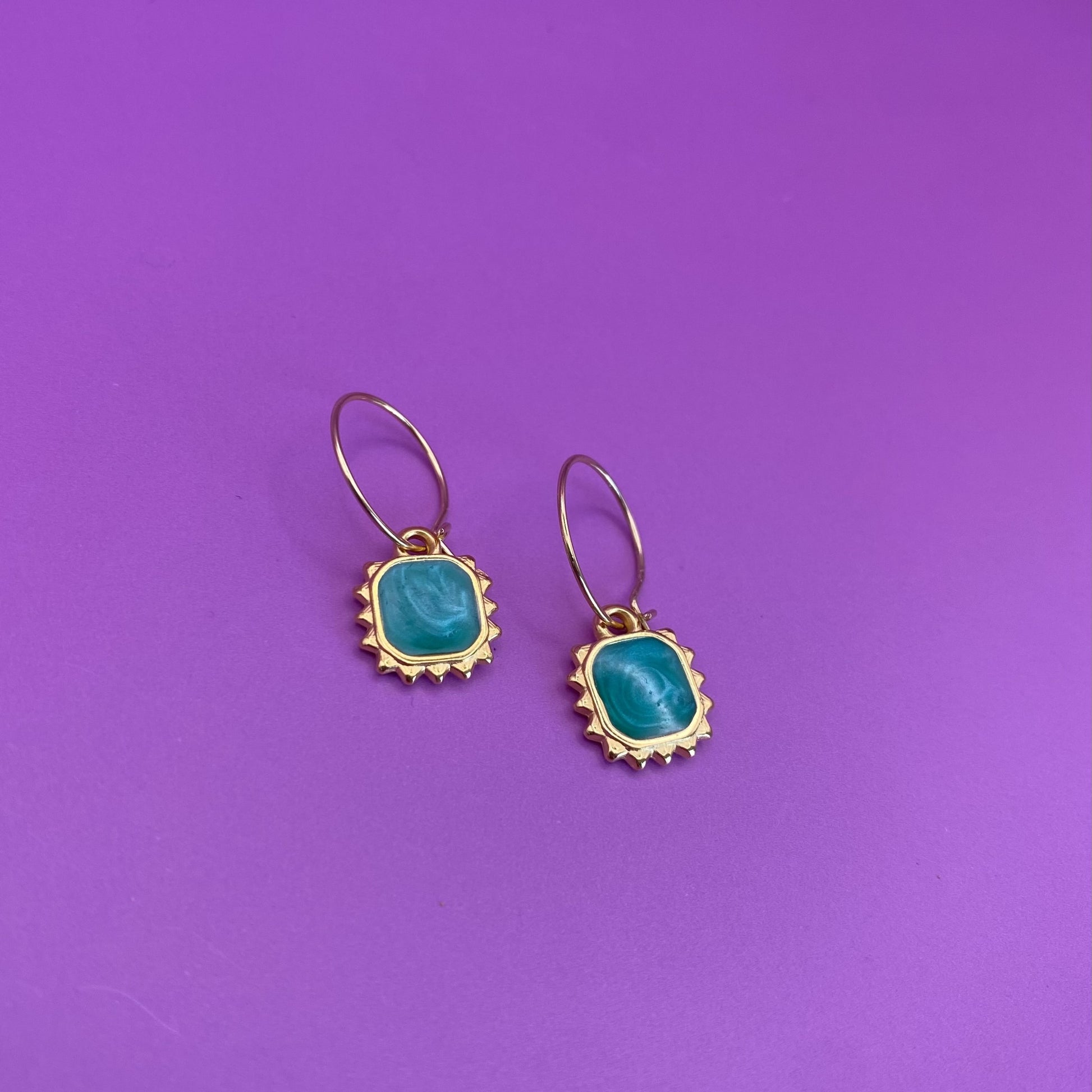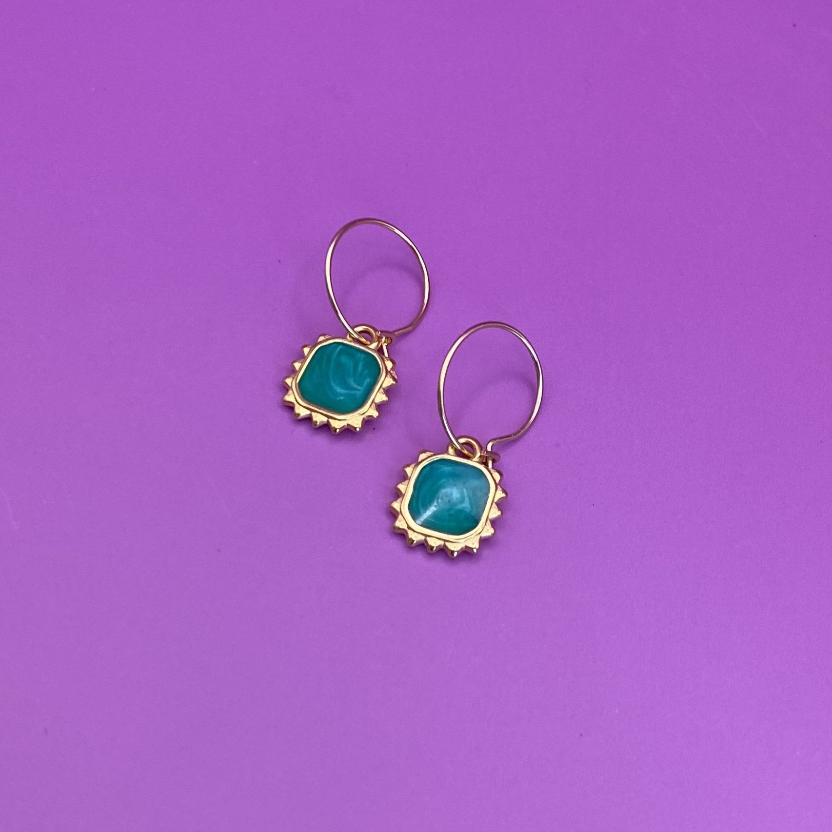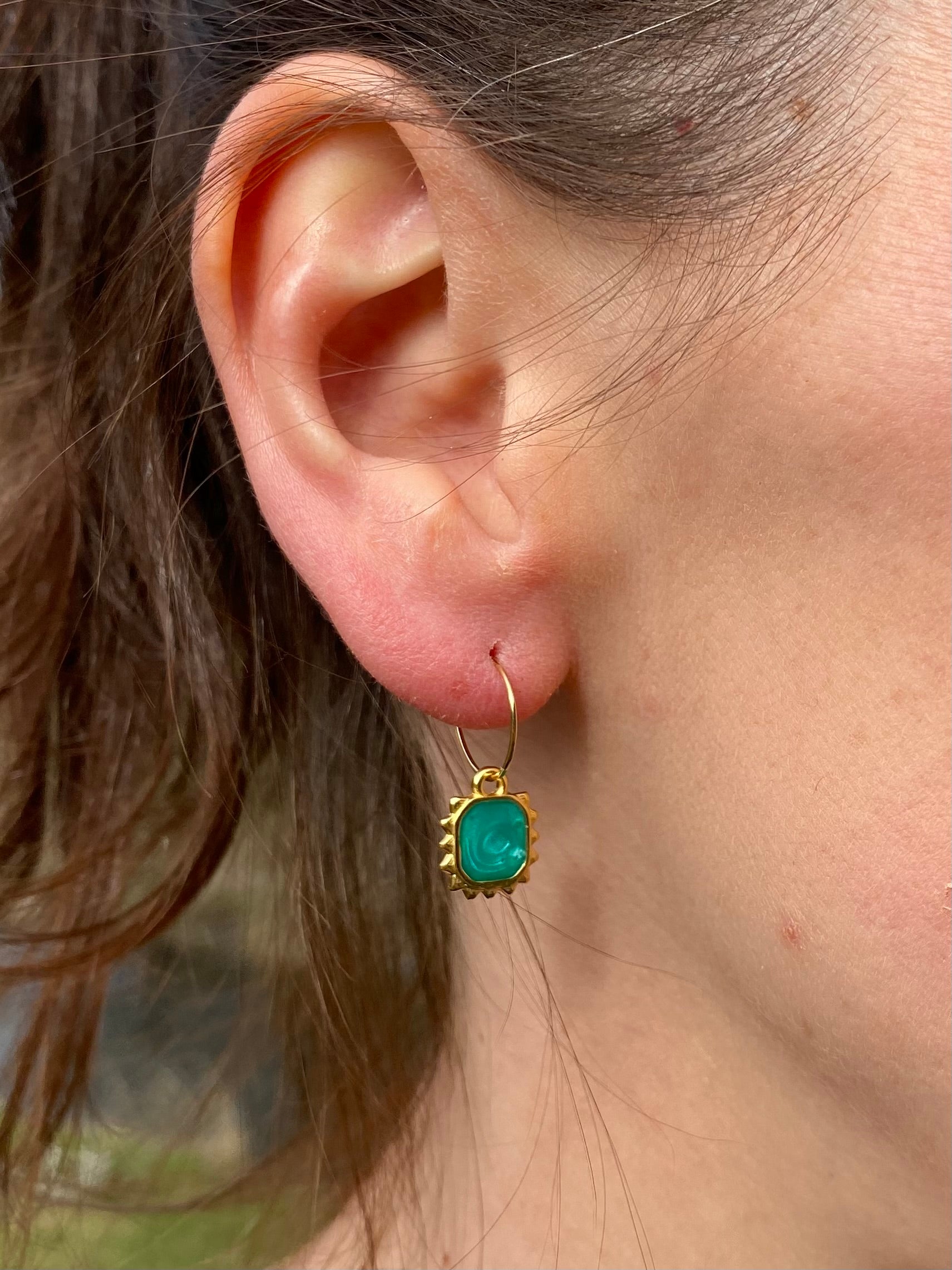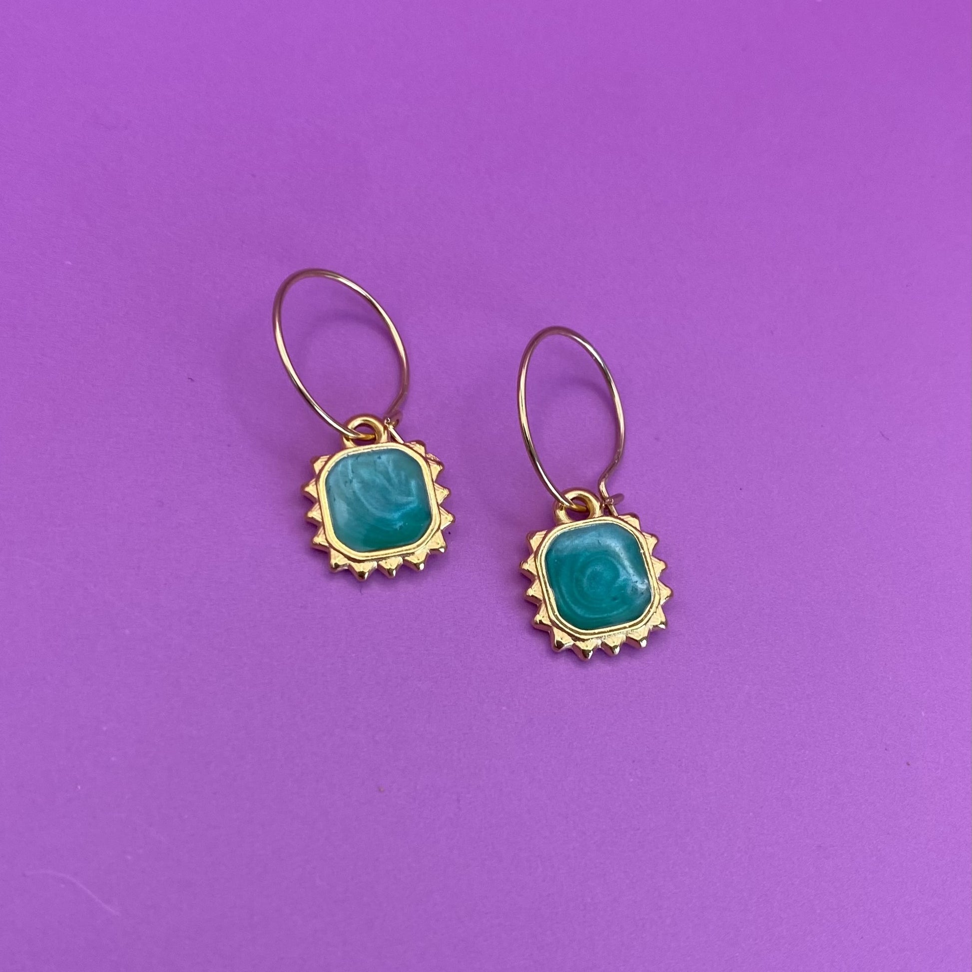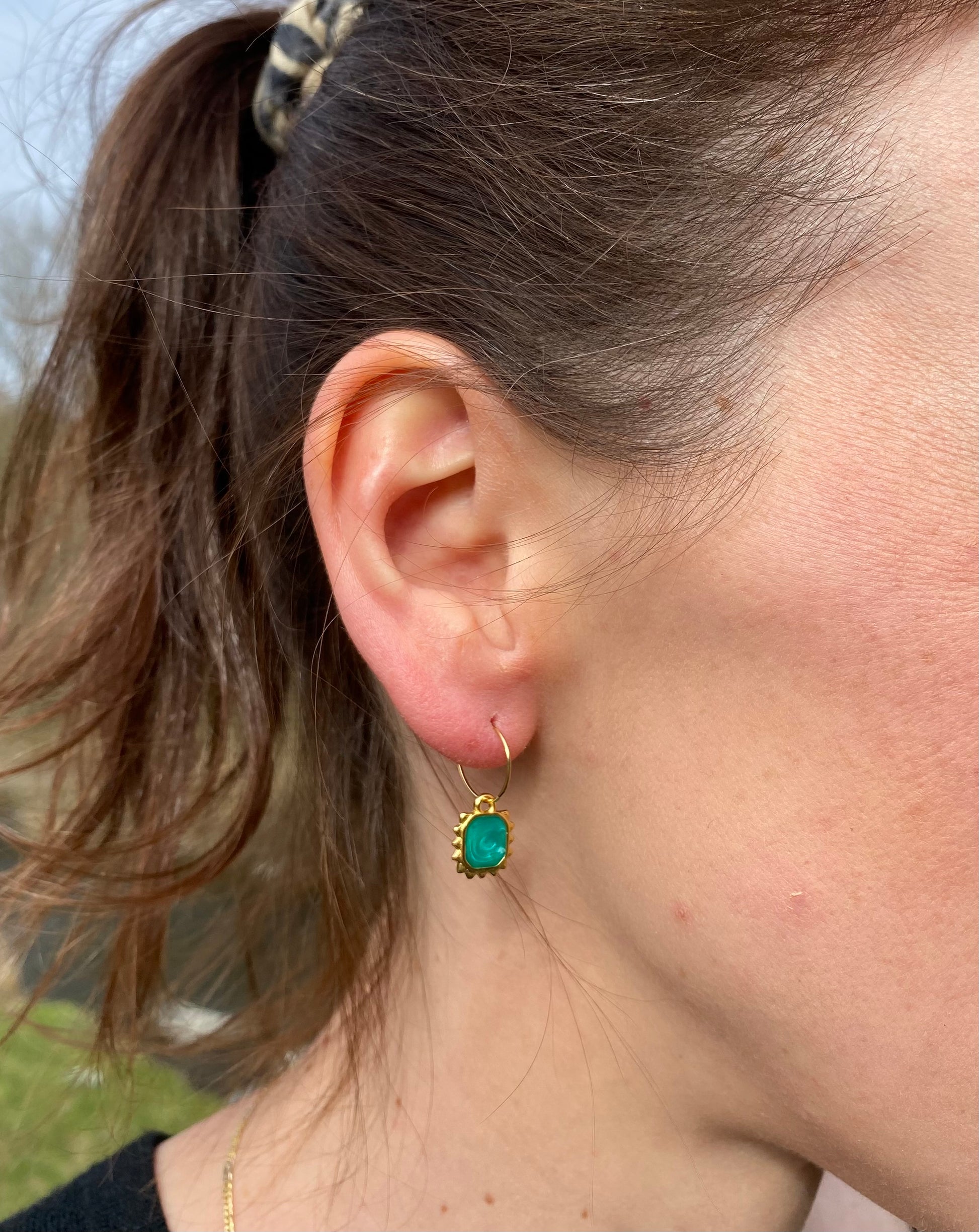 La 4, un soleil moderne : de petits anneaux ornés de breloques vertes aux nuances subtiles, irradiant des rayons dorés.